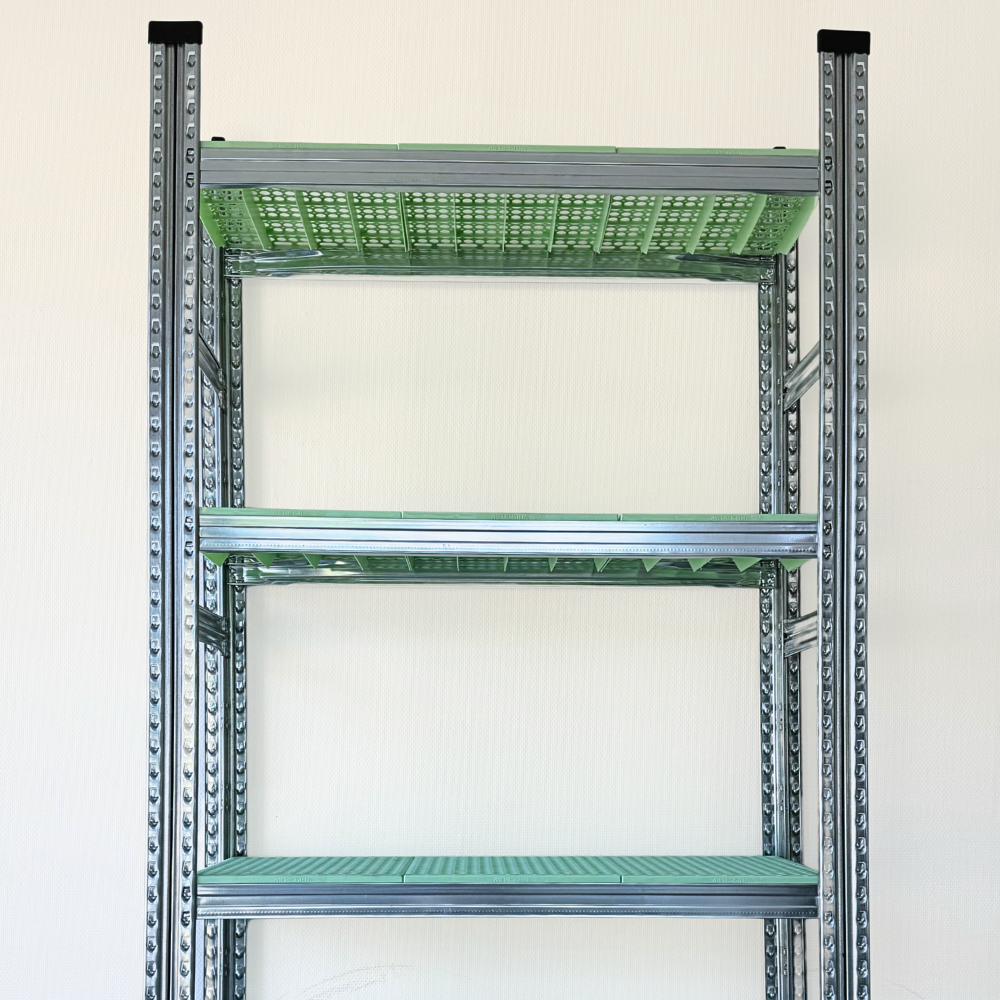 Kølerumsreolen er robust og hygiejnisk ideel til miljøer, hvor hygiejne er af høj prioritet, såsom butikker og kølerum. Plast hylderne har perforeringer, der tillader væsker at passere igennem. Hyldepladerne lægges direkte på hyldebjælkerne og kan nemt afmonteres for rengøring.